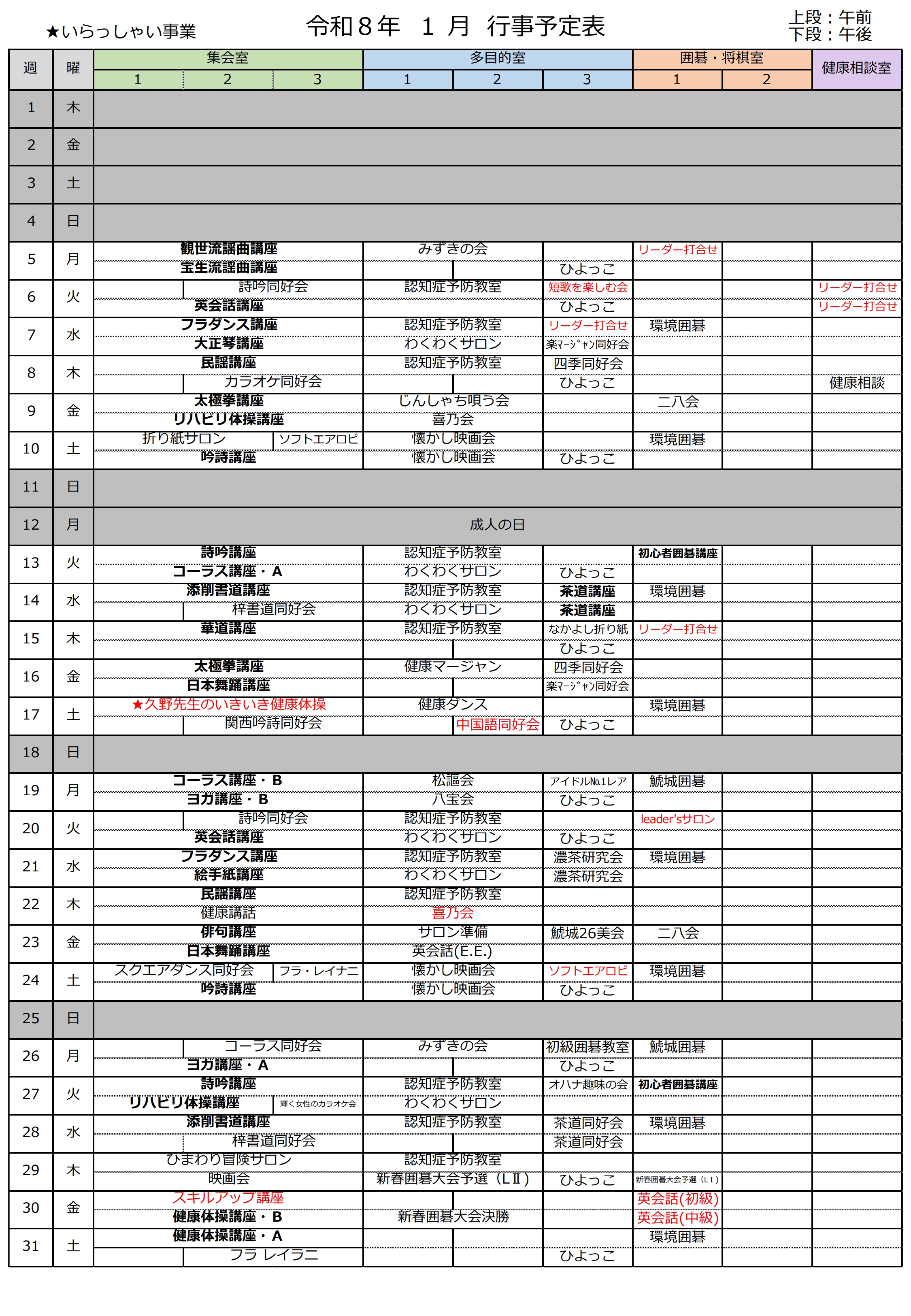 拡大 & 印刷用 令和8年1月行事予定表
