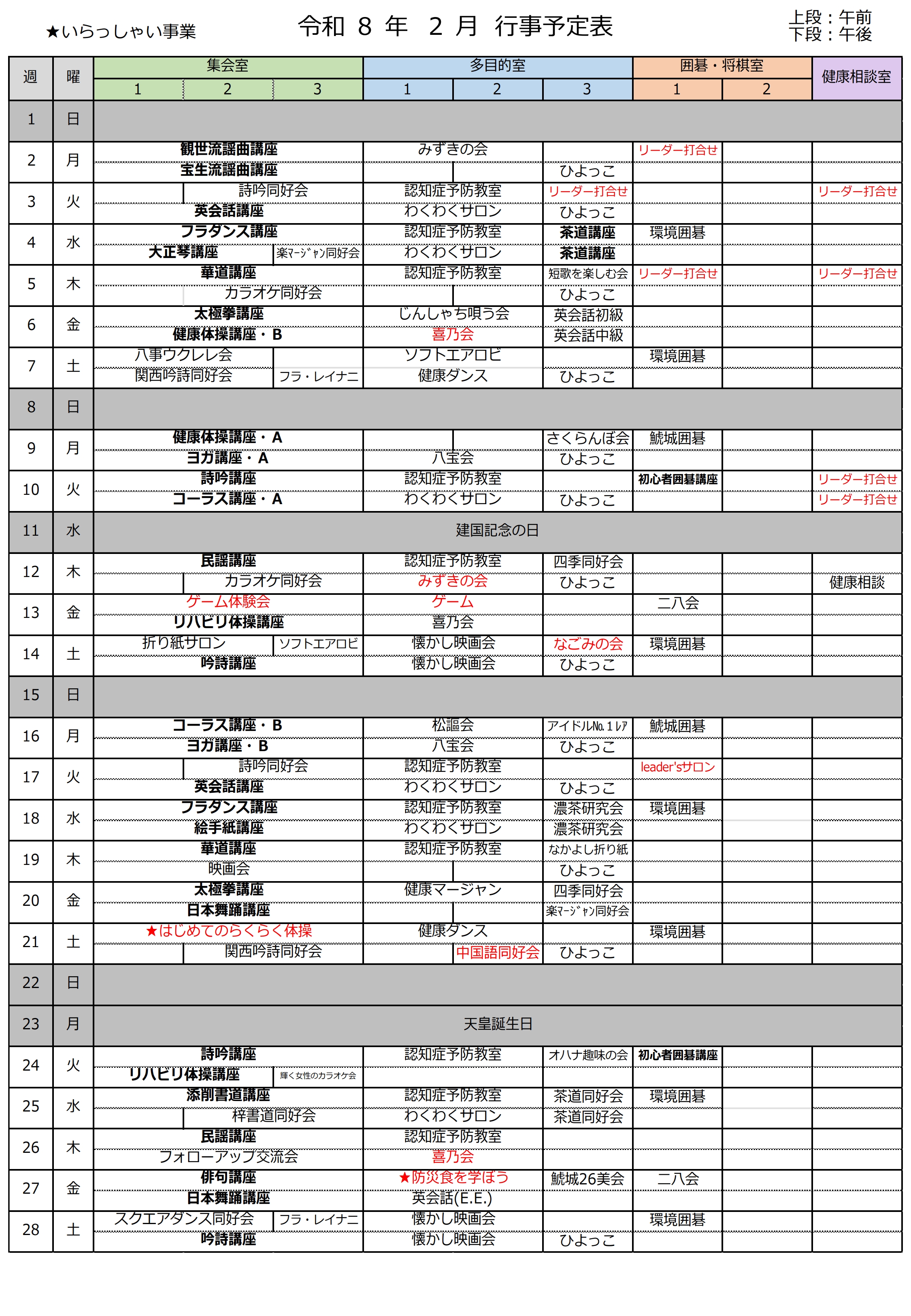 拡大 & 印刷用 令和8年2月行事予定表 & 1月行事予定表 へ